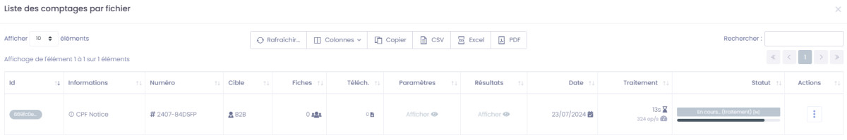 Cette fonctionnalité permet d'effectuer un comptage à partir d'un fichier d'entrée, de l'enrichir en données intégrées au Webservice, et d'extraire des contacts emails / téléphoniques / postaux à partir d'un fichier initial à enrichir - déposé par l'utilisateur.