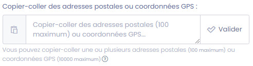 Pour insérer un grand nombre d'adresses géolocalisées, nous vous conseillons d'utiliser le champ copier/coller. Il vous permet d'insérer des lots d'adresses postales (100 max. par insertion) et/ou de coordonnées GPS (100 adresses ou 10 000 coordonnées GPS max. par insertion).
