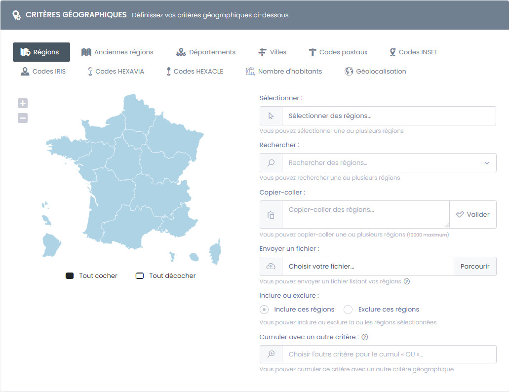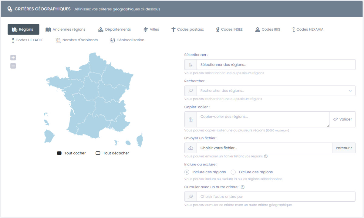 Cette catégorie permet de géolocaliser les profils à cibler. Cette géolocalisation peut se faire de façon plus ou moins fine, via les différents onglets disponibles :