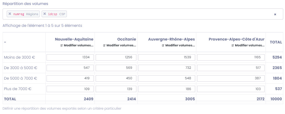 L'option "Répartition des volumes" permet de choisir une répartition personnalisée de la volumétrie totale à extraire, selon 1 à 2 critères de ciblage précis (par exemple répartition des profils par revenus et régions).