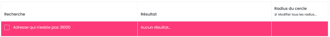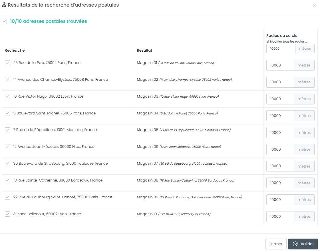 Vous pouvez alors définir un radius individuellement pour chaque adresse, ou appliquer un radius pour l'ensemble des adresses listées en cliquant sur l'option "modifier tous les radius"