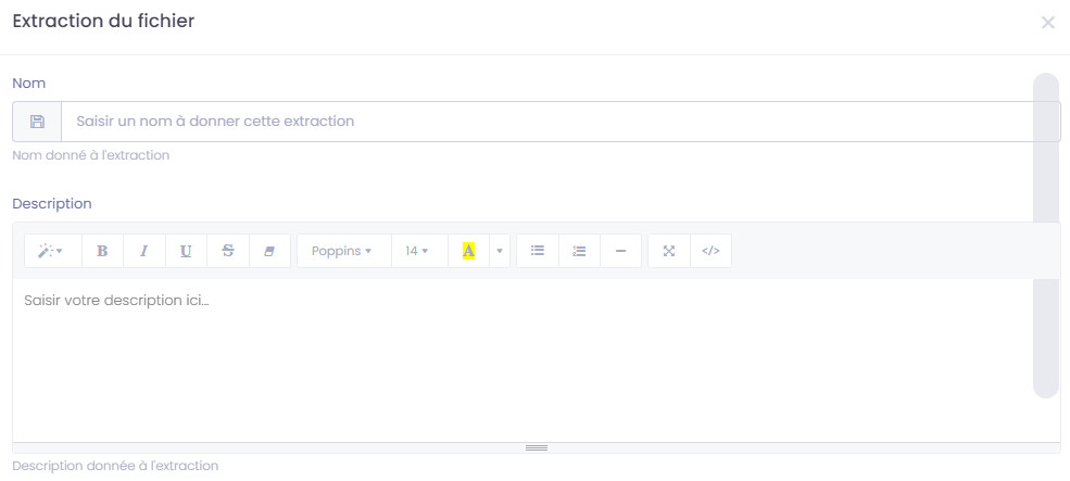 Vous devez définir ici le nom ou la référence de votre extraction (obligatoire) et y ajouter également une description détaillée (facultatif).